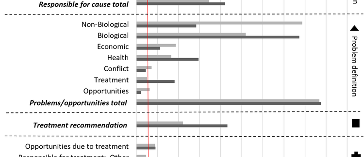 Frame variables were present in differing amounts in the ocean plastic and ocean climate change press releases, as can be seen in Figure 3. The main differences were that ocean plastic press releases referred to climate change but this happened almost never the other way around. Press releases on ocean climate change focused heavily on non-biological problems, whereas ocean plastic focused more on health- and biological problems. Lastly, press releases on ocean plastic paid twice as much attention to treatment and people’s responsibility to solve issues than press releases on ocean climate change did.