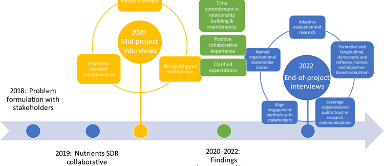 The results of this evaluation identified a few key lessons in a two-stage evaluation approach for community-engaged research projects (see Figure 2). The formative evaluation identified the novelty for scientific researchers of engaging in science communication at the EPA during the research process and identified several ways to improve the ongoing project. EPA researchers repeatedly mentioned, “We did more engaging with our stakeholders from the get-go and more conversations about what their needs were and how to make this a better project for them.” Including the end-of-project evaluation allowed us to document how the project team incorporated early recommendations and how relationships and research evolved. Importantly, having data from these two time points with largely the same participants allowed for documenting how interviewees’ perspectives on and recommendations for solutions-driven research changed from before to after implementing experiments. Both formative and end-of-project interviews were essential for us to evaluate how continued engagement in a transdisciplinary project confirmed early perspectives on the significant amount of time commitment required to build and maintain relationships, the positive experience of collaboration, and the need to clarify expectations. In the end-of-project interviews, interviewees felt less strongly about the challenges associated with sharing results. This change points to both the progress in navigating existing communication processes to share results and how the conditions at the time of an interview influence interviewees’ primary concerns. Additional lessons that resulted from having participants reflect on their experience at the end of the project include the need to (1) leverage community-based organizations for public trust in research communications, (2) vary engagement methods and venues to align with varied stakeholder perspectives, (3) adapt to evolving stakeholder roles and priorities, and (4) have a named liaison for stakeholder engagement within each organization to reduce the effort required to build connections.