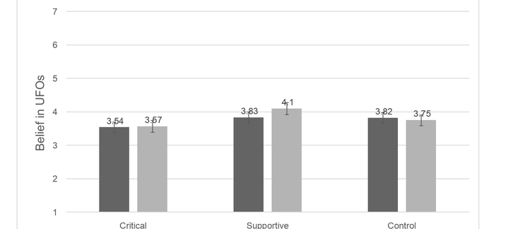 Pre-test, participants reported an average belief in UFOs slightly below the mid-point of the scale (M = 3.73, SD = 1.59), indicating that, on average, they were slightly more inclined to disbelieve in alien UFOs than to believe in them. Post-test, the mean score was slightly higher (M = 3.80, SD = 1.69) as an overall sample average.