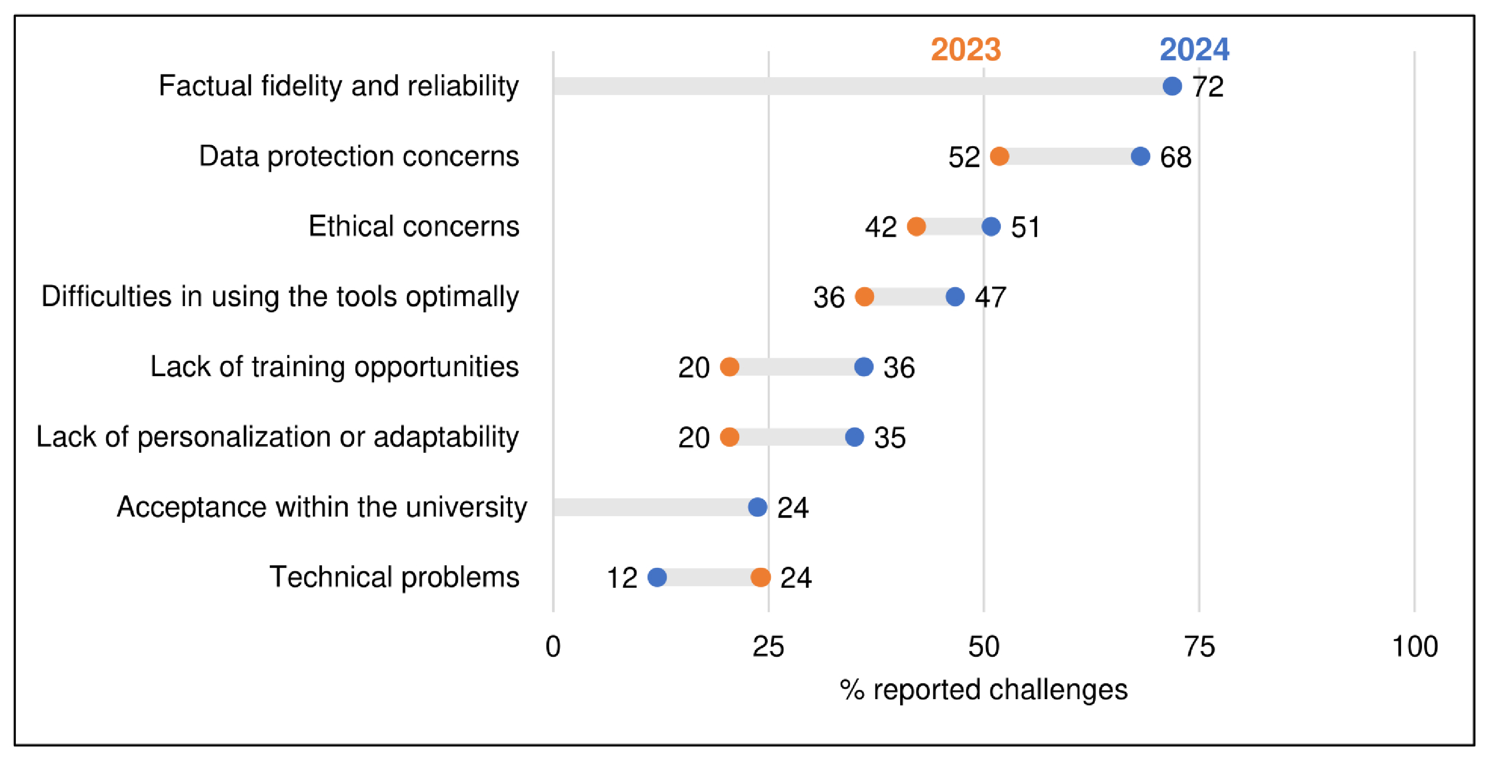 From 2023 to 2024, technical problems decreased notably (from 24 % to 12 %), while concerns about factual fidelity and reliability remained the dominant challenge (72 %) alongside growing data protection concerns (increased from 52 % to 68 %). The data shows increased difficulties in optimal tool usage (36 % to 47 %) and lack of personalization (20 % to 35 %), suggesting that as technical barriers diminish, implementation and customization challenges become more prominent. Notably, the need for training opportunities has grown (20 % to 36 %), while ethical concerns increased moderately (42 % to 51 %), indicating a shift from technical to practical and ethical considerations in AI adoption. (Figure 7)