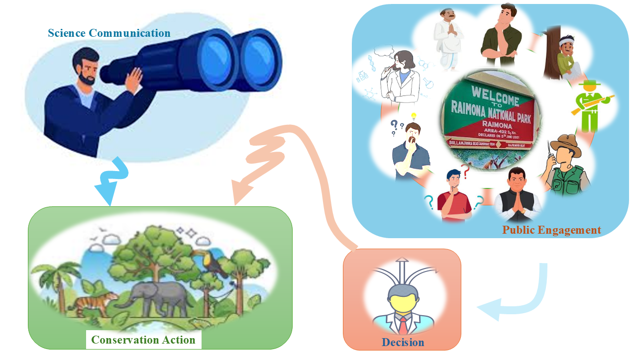 Human-wildlife conflicts in Raimona National Park highlight the intricate balance between biodiversity conservation and local livelihoods. Studies [Daimary & Kumar, 2024; Daimary & Deka, 2025] indicate that habitat fragmentation, agricultural expansion, and resource dependency have led to increasing encounters with elephants, leopards, monkeys and wild buffalo. These conflicts often arise due to overlapping habitats and limited mitigation strategies. Communication and public engagement are crucial in addressing conflict by bridging the gap between scientific knowledge and local communities [Pooley & Schwarzenegger, 2017; Kumar & Daimary, 2024]. The Bodo community in Raimona has coexisted with wildlife for generations, yet their traditional knowledge is often overlooked in conservation policies. Participatory science communication [Ward et al., 2024] is the only approach to community engagement that fosters cooperation.