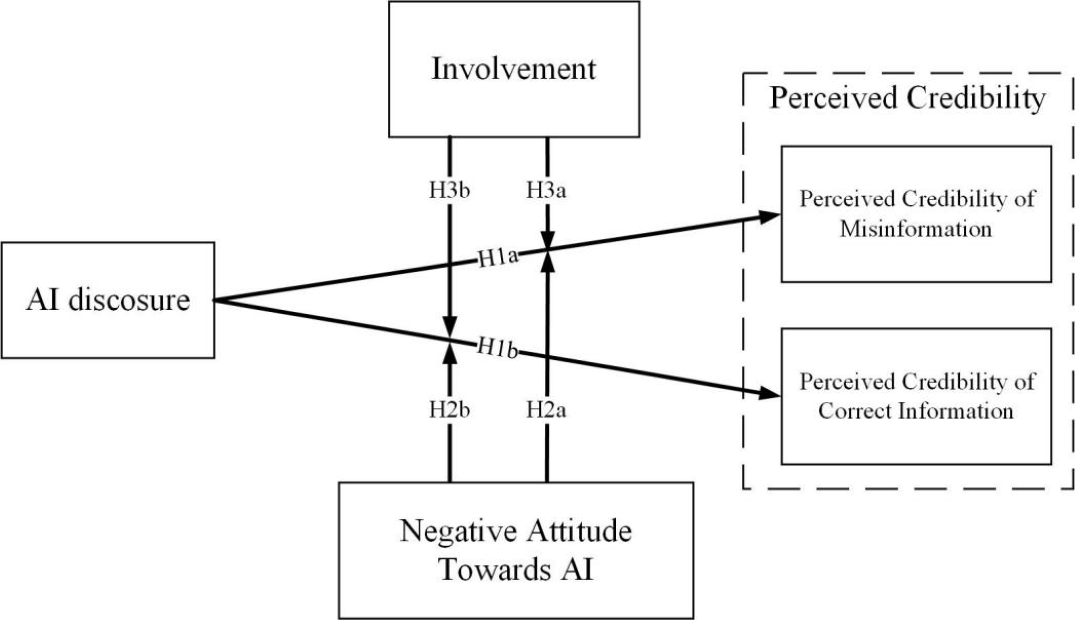 Cognitive Dissonance Theory suggests that when audiences’ knowledge, attitudes, and behaviours are inconsistent, they are motivated to adjust their behaviour or knowledge [Cooper, 2019]. Thus, audiences with negative attitudes towards AI [Negative Attitudes Toward Artificial Intelligence or NATAI] (a construct capturing predispositional scepticism towards AI technologies) may perceive AIGC as untrustworthy, or alternatively, revise their attitudes towards AI when the information itself is perceived as credible. However, there is limited empirical evidence on this potential moderating effect. Therefore, we propose the following research question: